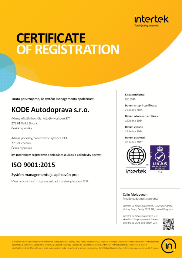 V roce 2003 získala společnost KODE Autodoprava certifikaci systému managementu jakosti ČSN EN ISO 9001. Podívejte se na video ze školení řidičů KODE Autodoprava